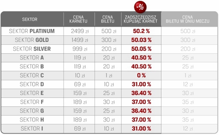 Ceny biletów i karnetów na rundę jesienną z bonifikatą dla posiadaczy karnetów w rundzie wiosennej: